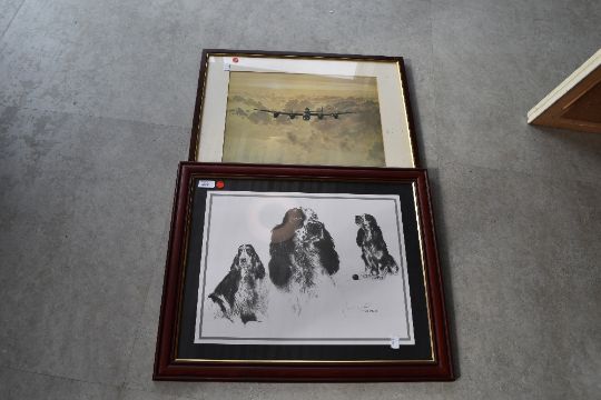 Two prints, one of a Cocker spaniel the other a Lancaster bomber.