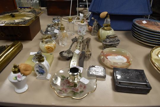 A selection of smoking and dressing table items including lighters scent bottles and cutlery