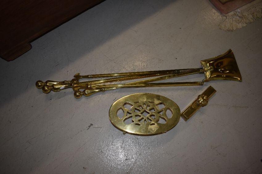 A selection of polished brass fire tools, including footman