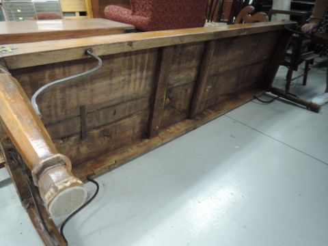 A large hardwood bench with brass and iron fixings , of Indian origin, quite possibly from railways, approx. dimensions length 197cm, depth 58cm height to seat 53cm, to back 107cm