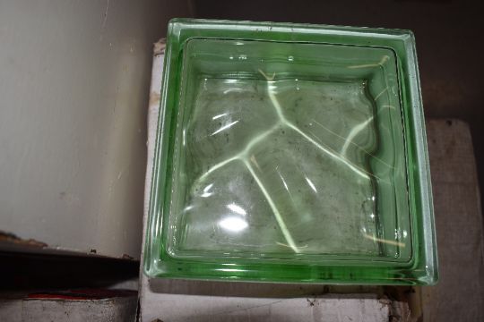 Eight packs of five green glass building blocks, each block 19 x 19 x 8cm