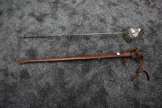 A British Infantry Officers Sword 1895 Pattern, made by Rob Mole & Sons Birmingham etched with George V Cypher and Crown & Shield, blade numbered M6334, with brown leather scabbard, blade length 80cm