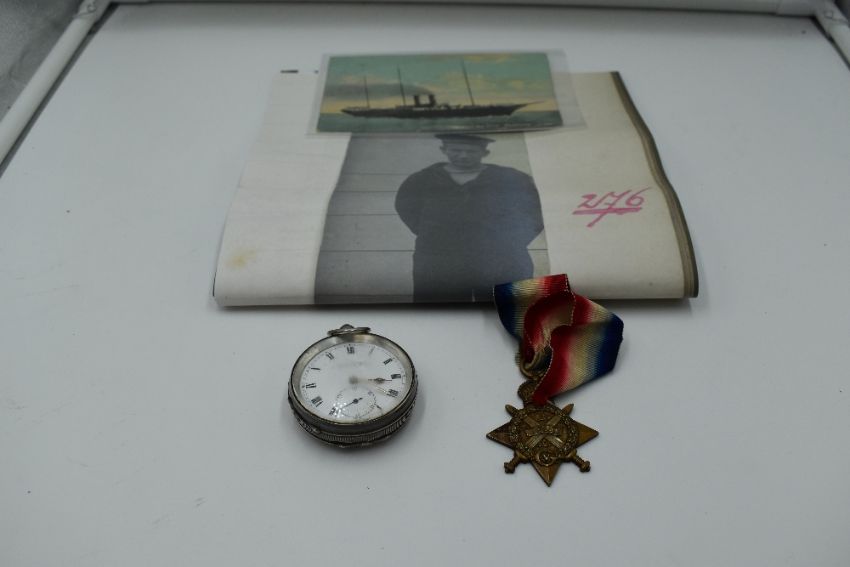 A WW1 Star to E Love STO ICL Benbow BTTN RND and a Silver Pocket Watch (af) Presented to E Love Of His Maj Yacht Alexandra with paperwork and postcard, E Love interned at Groningen Camp in Holland