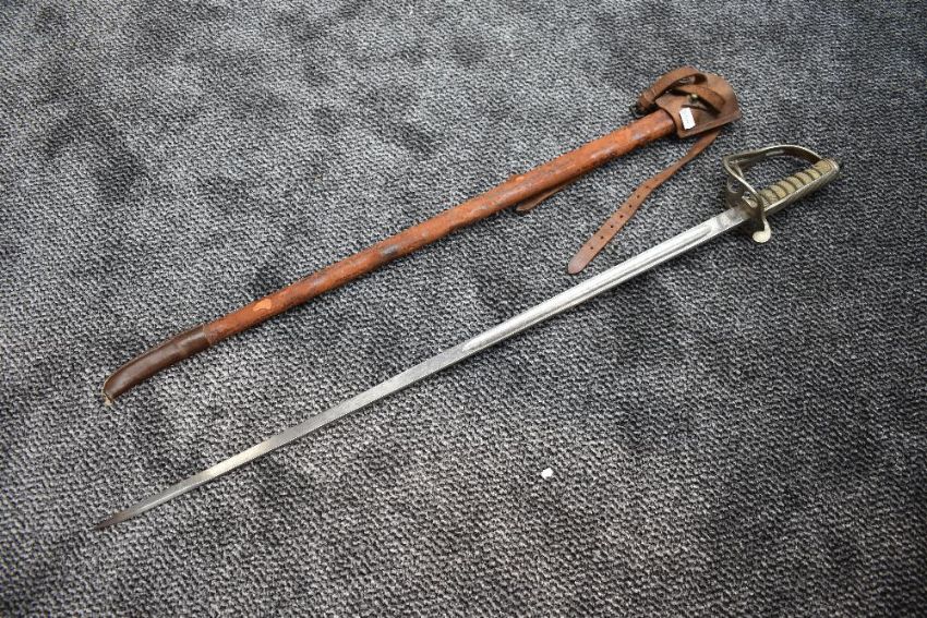 An 1821 pattern Royal Artillery Officers sword by Fenton Brothers Ltd. Sheffield, brown leather mounted scabbard and with wirework and shagreen grip, blade with proof stamp and etched with emblems of the Royal Artillery, Royal Coat of Arms, George V cipher and makers stamp. Blade, blade length 82cm