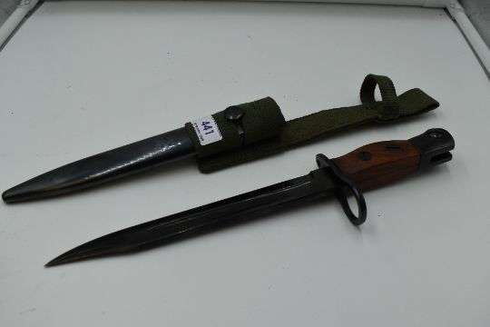 A British Issue No5 Knife Bayonet, to fit the Jungle carbine, blade marked RFI, blade length 20cm, having black metal scabbard and green webbing frog