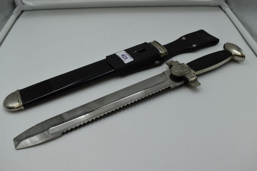 A German Third Reich Red Cross E. M. Dress Hewer,with leather frog, blade with saw back and square tip, metal scabbard, grip with eagle, swastika and cross emblem, blade stamped 'G.E.S. Geschützt'