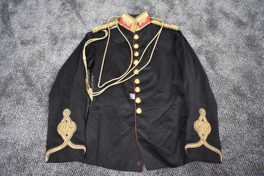 A Victorian British Royal Artillery Captains Dress Tunic in black with red trim having gold decoration, epaulettes, buttons and aiguillette belonging to Captain Laitham RA