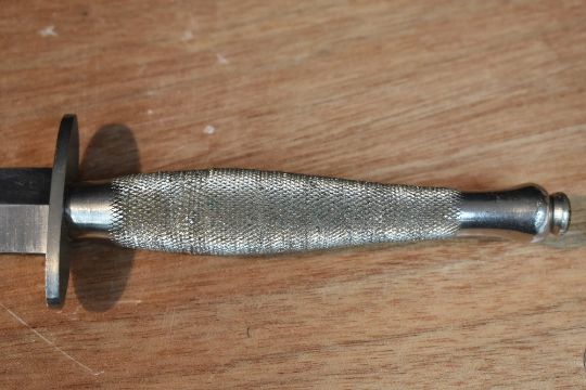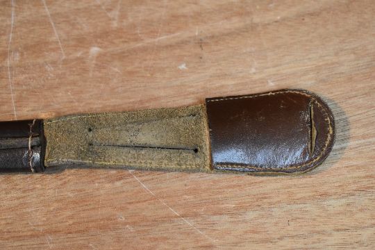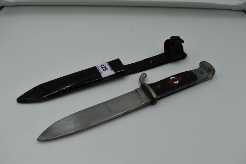 A German Third Reich Hitler Youth Dagger having black chequered grip with enamelled swastika emblem, blade marked RZM M7/13, with black metal scabbard and leather belt strap