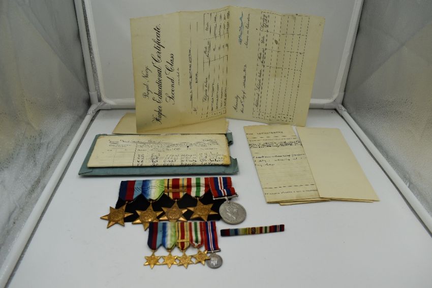 A collection of WW2 Medals, 39-45 Star, Atlantic Star, Africa Star with 42-43 clasp, Italy Star and War Medal, along with miniatures, all with ribbons to Frank Gordon Harvey, Artificer , commencement of service 1923, retired 1955 along with photographs and service documents