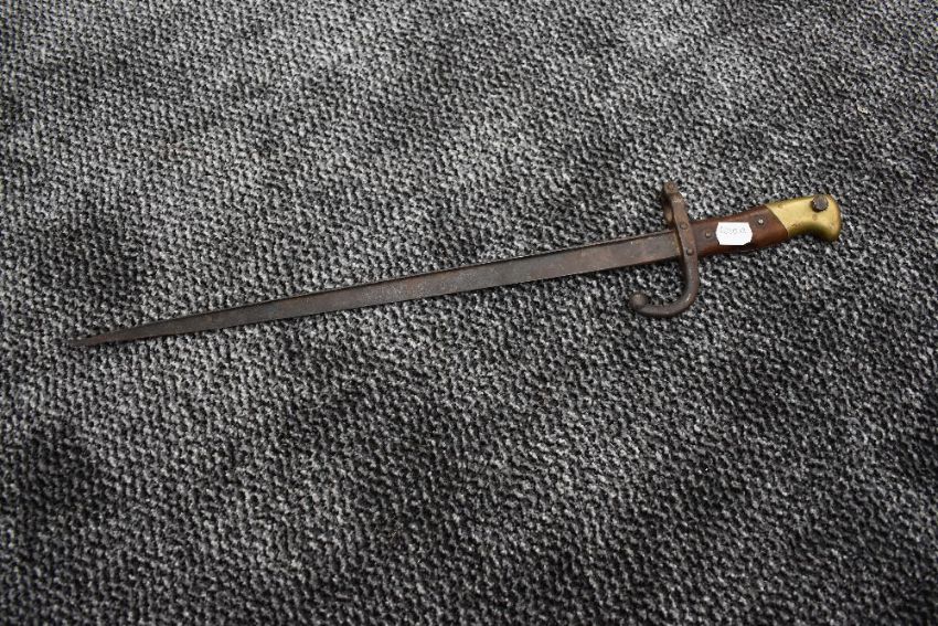 A French Gras Rifle model 1874 Bayonet, tip of blade bent, edge of blade inscribed 1878, no scabbard