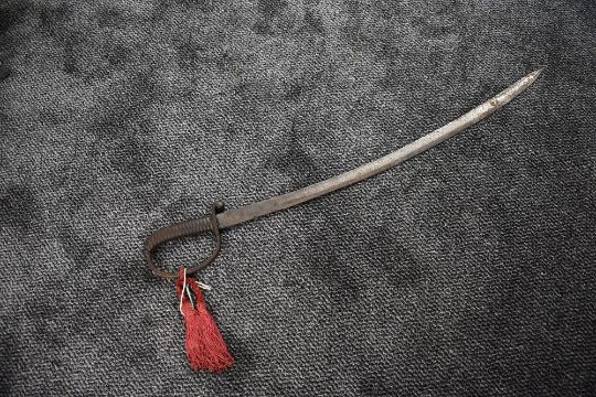 A sword possibly naval cutlass, 19th century, with cast iron hilt, curved 30.6inch blade, blade engraved with scroll pattern