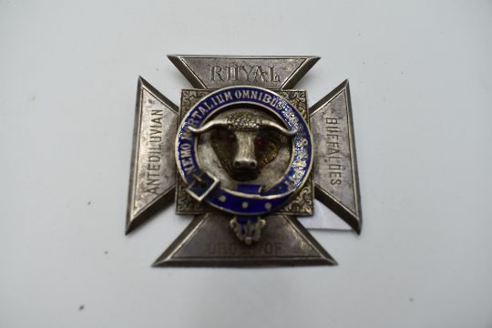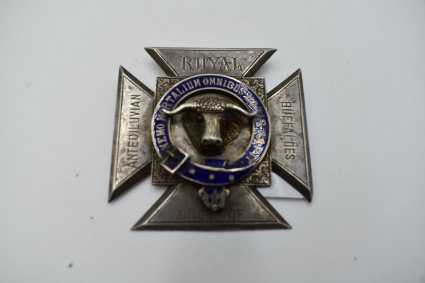 A Silver Medallion in cross form for the Royal Order of Antediluvian Buffaloes with blue enamel, buffalo head and red glass eyes, dated 1889, hallmarked, inscribed on reverse, 71.1 g