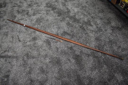 A possibly medieval wooden Long Bow, flat to one side and other side curved, with unassociated metal Arrow Tip