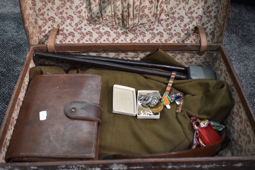 A Military Collection relating to the Wild Family including to a pair of WW1 Medals to 37140 Pte . F. Wild. D.C.L.I., a WW2 Defence medal and a Police Long Service and Good Conduct medal both to Const. Douglas Wild and a Lancashire Constabulary badge and two life saving society badges, a WW2 Uniform to Luet T Wild East Lancashire Regiment including belt with sword hanger, all badges and buttons, box of spare buttons, suitcase bearing name T Wild and similar briefcase, also a WW2 39-45 Medal, a Great War Medal to 19150 Pte T.Ogden Liverpool Regiment, a Silver Medallion, a 1937 Coronation Medal and a similar Hankerchief