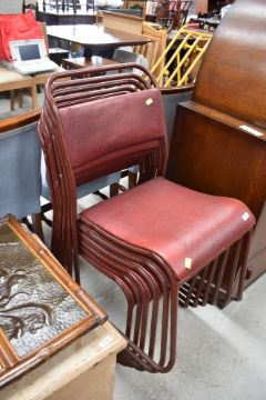 A set of six vintage stacking chairs, having read leather seats and tubular metal frames