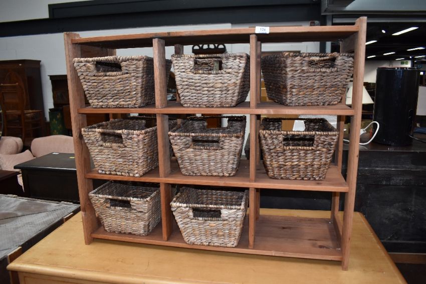 A modern pine 9 compartment storage unit, with 8 baskets, approx. dimensions W84cm H69cm D31cm