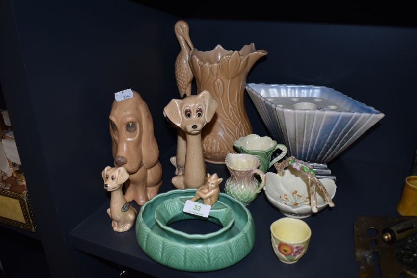 A good selection of Sylvac ware including large floral jug with stork detail in beige, smaller jugs, various dogs and a rose vase, elven items in total.