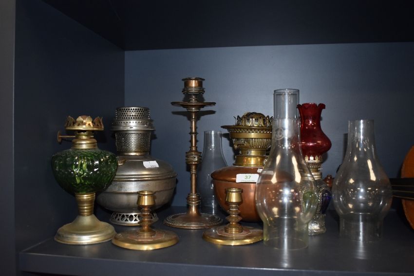 A collection of Vintage and antique oil lamps, chimneys, and candlestick holders some having arts and crafts styling and others glass.