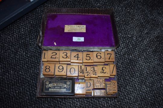 A Early 20th century shop or store printing block set, included are numbers, fractions and weights and increments, marked Percy Leslie 14 Church street, Egremont, near Liverpool.