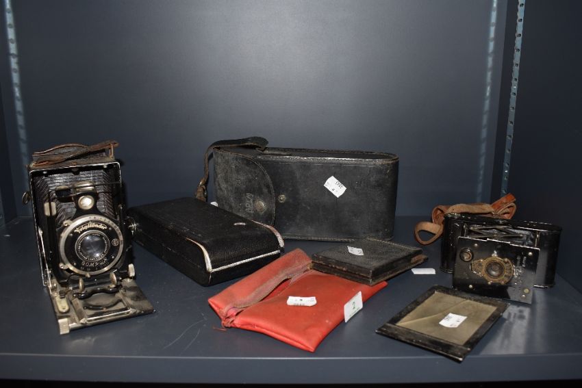 A selection of vintage cameras, including Vest pocket Kodak,Rollex vuiglander plate camera and more.