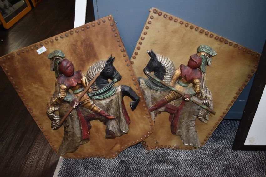 Two wooden shield decorative plaques, depicting knights on horseback.