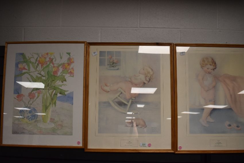 Two prints after Bessie Pease Gutman, and abstract floral print after Richard Ackerman.