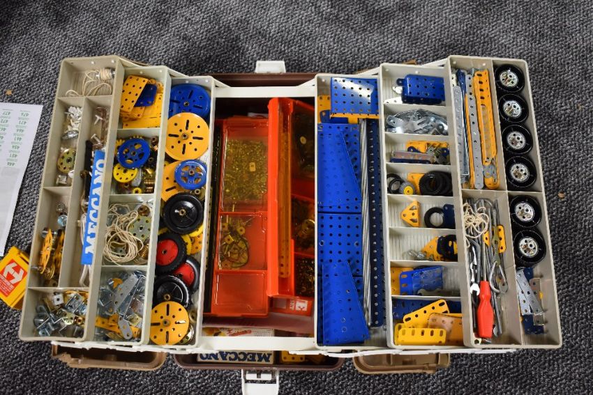 A folding box of Meccano and booklets including Crane Construction, Booklets 2/3/4 silmilar period etc