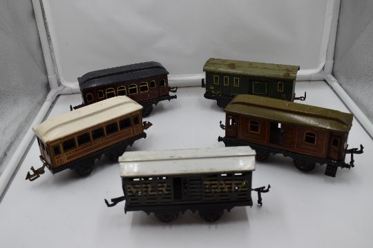 Five Bing and similar tin plate 0 gauge Four Wheel Coaches and Wagons