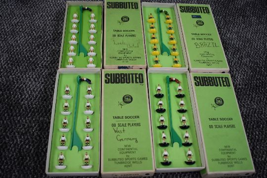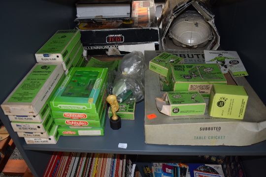 A shelf of mixed vintage Subbuteo including eleven early complete teams, Newcastle , Crystal Palace, Liverpool, W.Germany, England, Leeds, Brazil, Wolves, AC Milan, Blackpool and Alloa, later teams Manchester United, Liverpool 2nd and England, accessories etc along witha Table Cricket part set, all boxed
