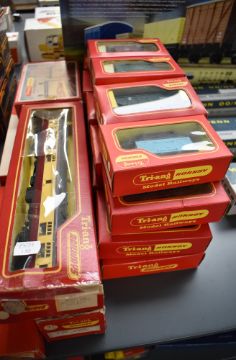A Collection of Triang and Traiang Honby 00 gauge comprising 19 items of rolling stock, one carriage, a Tank Cleaning Car R344, a 0-6-0 Diesel Shunter R152, Colour Light Signal Gantry R573 and Operating Royal Mail Coach Set R402, all in original boxes