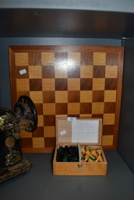 A wooden chess board and box of chess pieces.