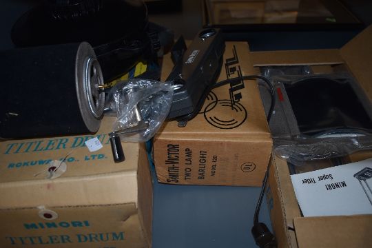A selection of various pieces of photographic equipment including Minori Titler Drum, Rukowa Super Titler, a 16mm development tank and a Smith Victor two lamp Barlight