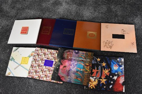Nine Royal Mail Post Office Year Books, 1984 to 1992, with slip cases and stamps