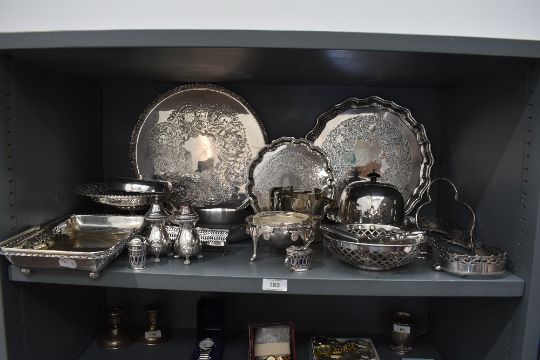 A selection of silver plate including domed butter dish, salvers, table basket, cruet, flatware, tazza etc