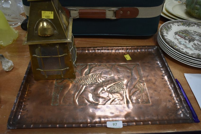 An arts and crafts hammered copper tray having coy carp or similar amongst kelp and a brass and glass lamp shade having latticed guard details to sides.