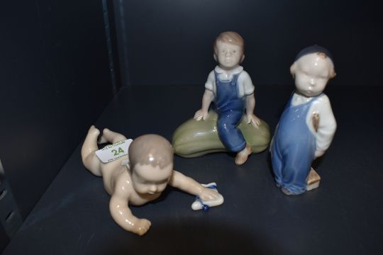 Three Royal Copenhagen Figures, Crawling Baby, model no 1739, length 15cm, Boy with Brush, model no 3250, height 12cm and Boy seated on Marrow, model no 4539, height 12cm
