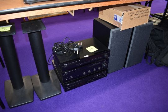 A selection of stackable Yamaha units including TX-480L , AX-380 CDC-645 with accessories and speakers with stands