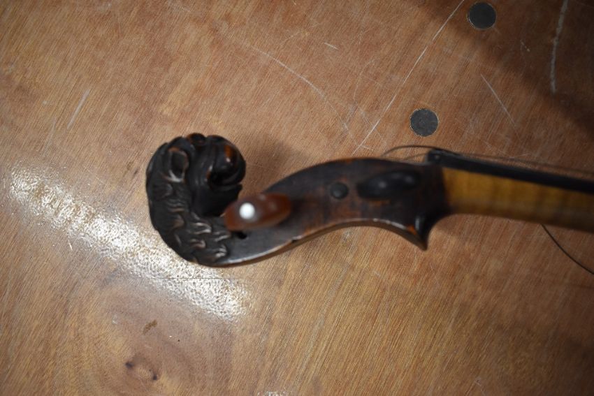 A distressed dark stained 19th Century violin having lion mask scroll, on piece back and traditional wooden case
