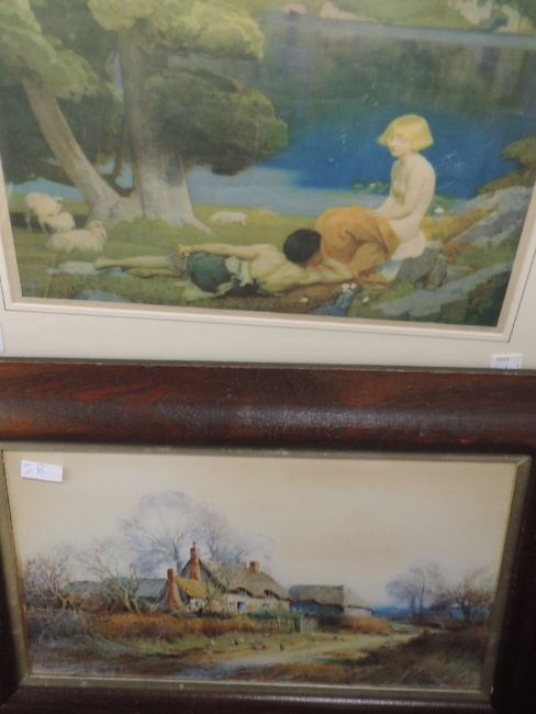 A pair of etchings, after W Monk, The Tower of London, and The Bank, signed, 20 x 26cm, framed and glazed, a print after Harold Speed, Daphnis and Chloe, 30 x 35cm, framed and glazed, and a print after Sylvester Stannard, country cottage, 25 x 43cm, framed and glazed