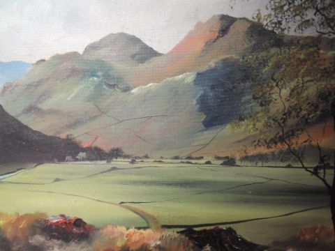 An oil painting on board, S J Bottomley, Langdales, Lake District, signed and dated 1960, 45 x 72cm, framed