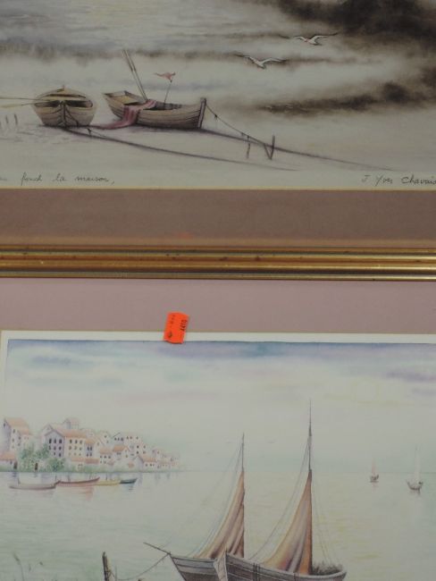 Two prints, after J Y Chevais, A Village au bord de L'eau, 27 x 38cm, and A fond La Maison, 28 x 40cm, both framed and glazed