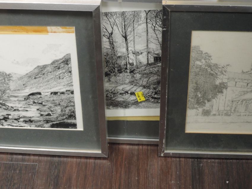Three sketches, C W Thompson, woodland farmstead, signed, and dated 1980, 26 x 26cm, river bank, signed and dated 1980, 24 x 40cm, and priory, 28 x 33cm, signed and dated, all framed and glazed
