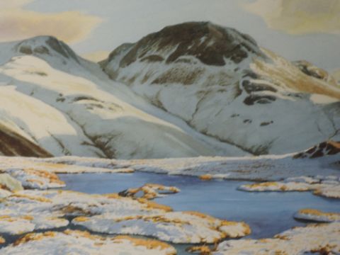 A watercolour, Geoffrey H Pooley, Great and Green Gables, over a Lakeland Tarn, signed and attributed verso, 38 x 50cm framed and glazed