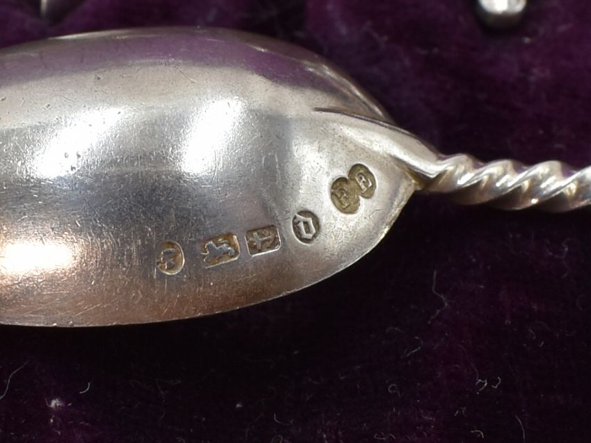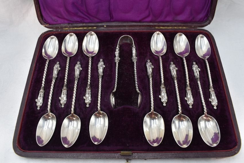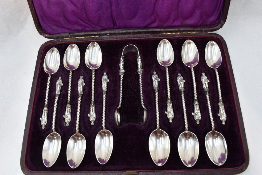 A cased set of twelve Victorian Apostle teaspoons with matching sugar nips, all having twist stems and statue style Apostle terminals, Birmingham 1879, Elkington & Co