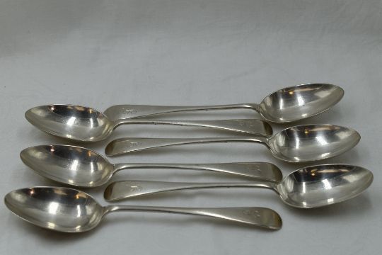 Six Edwardian silver dessert spoons of plain form bearing monogram G to terminals, Chester 1906, Walker & Hall, approx 301g