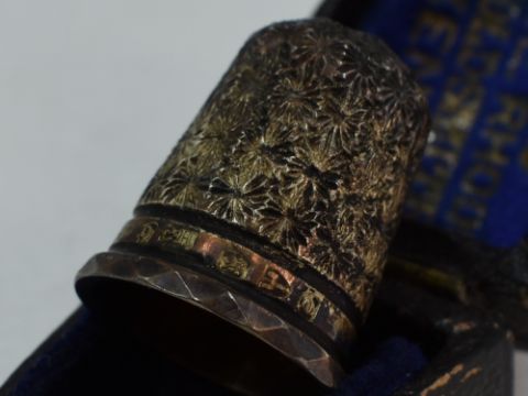 A small selection of HM silver and white metal including a cased Victorian silver thimble of traditional form, Chester 1897, Charles Horner, cut glass dressing table pots with silver lid/rim, propelling pencil stamped sterling and inscribed W J Furse & Co Ltd Manchester