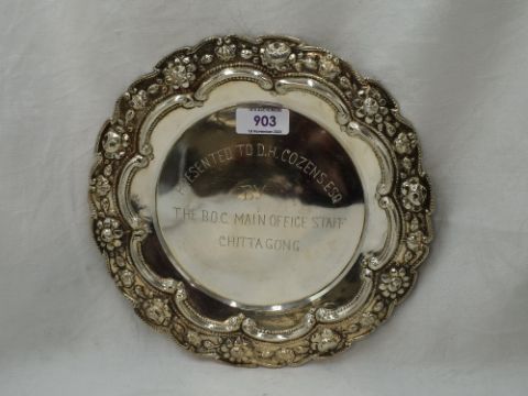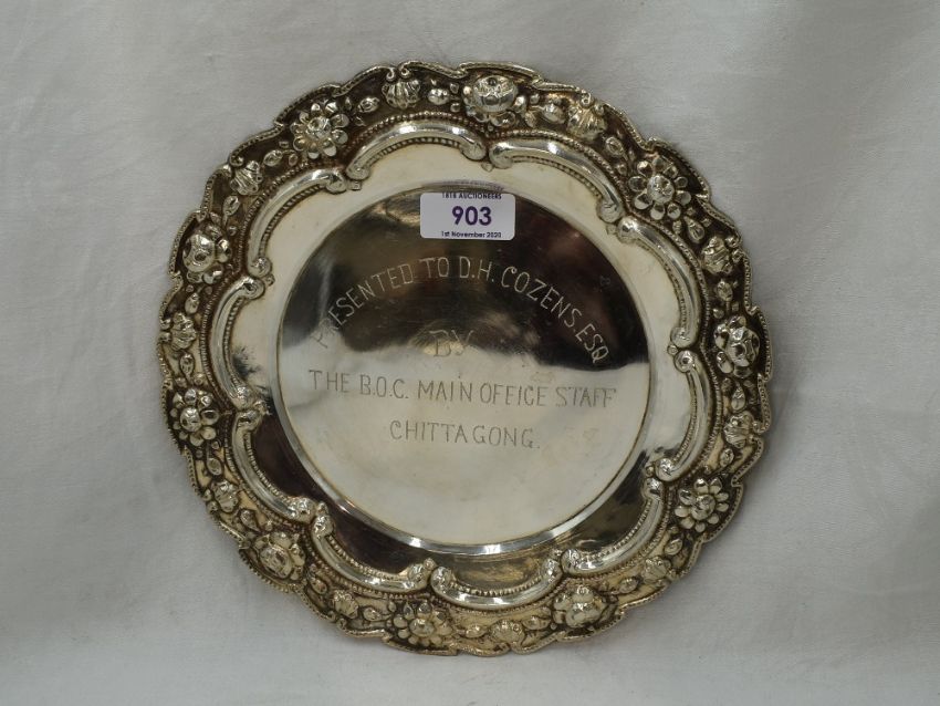 A white metal plate having repousse floral and scroll decoration with central presentation inscription by office of Chittagong, no marks, tested as silver, approx 191g