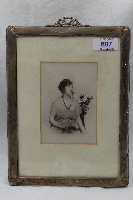 A silver photograph frame of plain rectangular form having moulded ribbon detail to top and velvet easel stand, marks worn, probably London