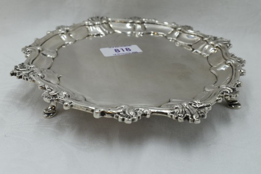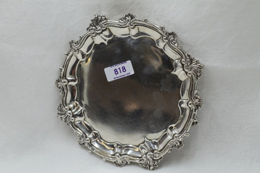 A Georgian silver card tray having decorative pie crust rim, trefoil hoof feet and bearing presentation inscription to base, London 1828 Charles Fox II, approx 350.2g
