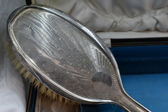 A cased part set of silver dressing table brushes having having engine turned moon shine decoration, Birmingham 1924/25 Samuel M Levi, and two small HM silver photograph frames
